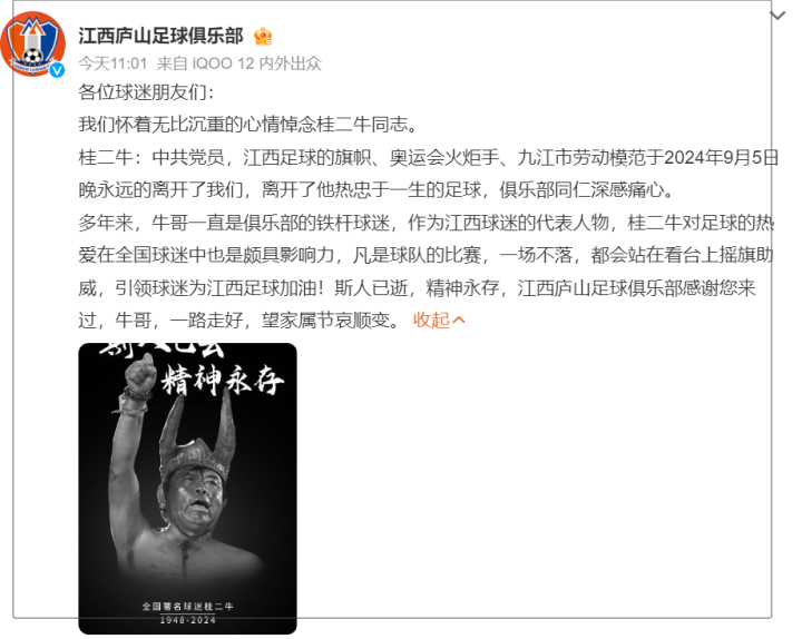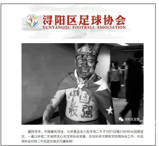 据江西浔阳区足球协会:知名球迷、北京奥运会火炬手桂二牛于9月5日晚23时40分因病逝世。